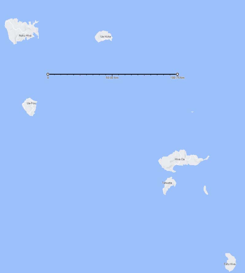 This map shows the Marquesas Islands with a 100 Km scale bar.