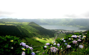 intensively farmed. This huge crater of Sete Ciduades has farms and villages on the bottom, while the steep sides are heavily wooded. The roads down into the crater are small and steep, but very well built. Despite this, we were surprised to meet a number of tourists who looked down into the crater from this viewpoint, but felt it was "too dangerous" to drive down to the bottom. |
