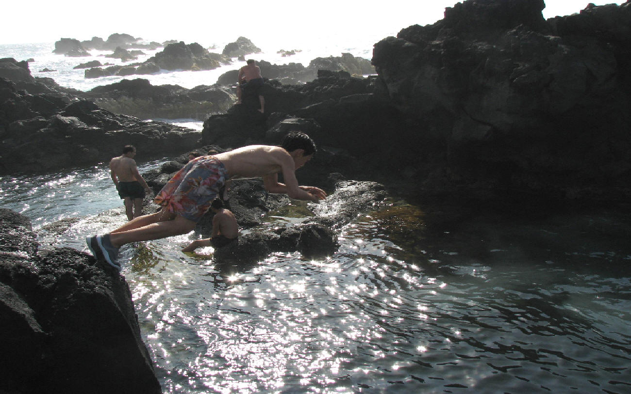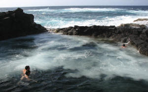 There are only a few very tiny beaches, so most coastal villages have built swimming holes in the rocks by adding a few small concrete dams and pathways. These are generally calm, but the odd breaker finds its way in. The background to these swimming photos shows just how inhospitable most of the coast is to arriving mariners. |