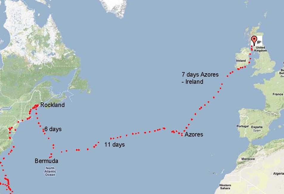 | We spent much of the summer sailing from Rockland, Maine in USA to Scotland, and also a few weeks cruising around the Firth of Clyde in Scotland. | At the time of writing, 23rd December 2008, we are back home enjoying the snow, having sailed from Rockport, Maine, to Bermuda (stayed a week) the Azores (stayed 5 weeks) then to Ireland, on to Scotland and left Milvina in Ardrossan in the Clyde for the winter. |