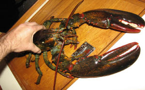We started our cruise by eating lobster, including this giant, while working on Milvina in Rockland, Maine, where we had left her for the winter. All went well till we launched, when we found that the motor overheated seriously within about 2 minutes of opening the throttle. After 3 days, with Volvo mechanic help, we were becoming desperate. Then Andre Poirier, back home in Quebec, found the solution on a web site. Problem was some poor Volvo engineering that let a plastic orifice in a copper pipe loose the first time we stored the boat in cold weather. We fixed it in 5 minutes, once diagnosed. |