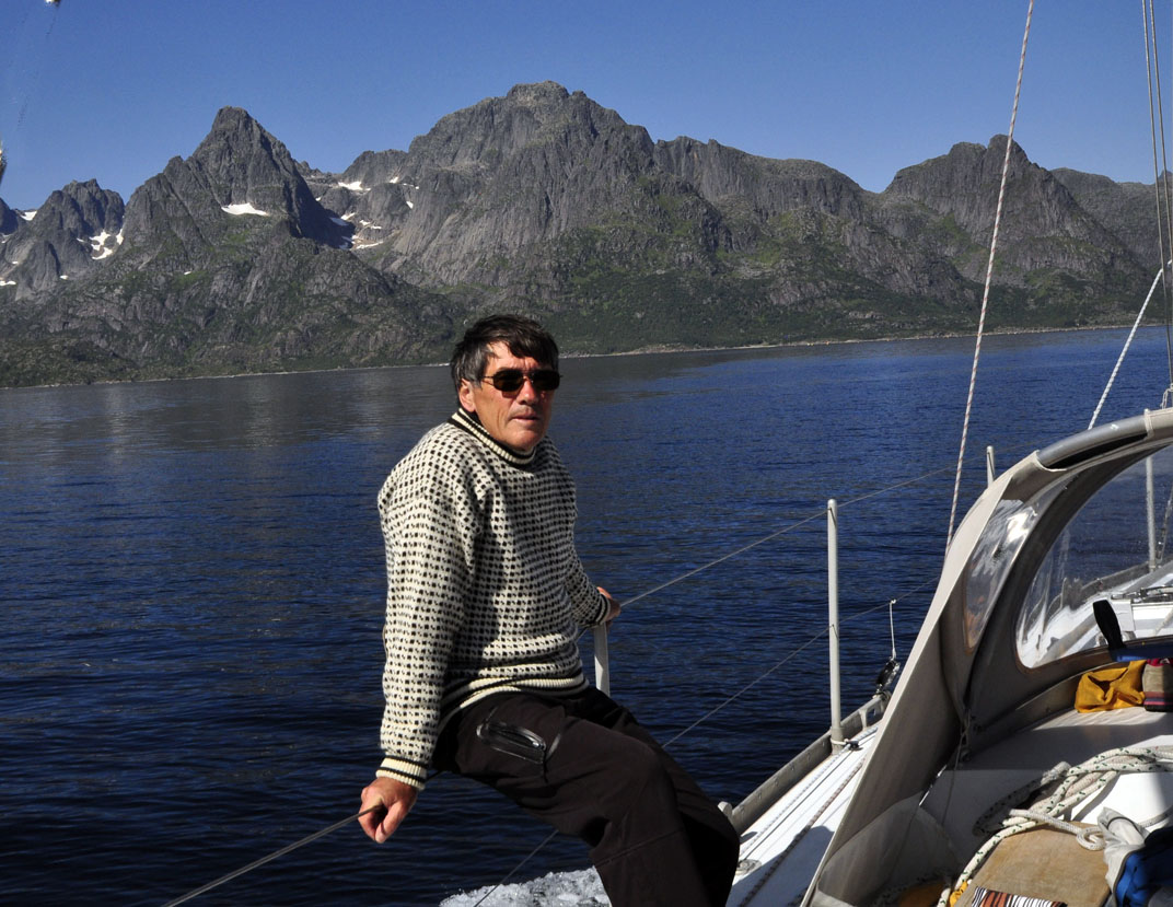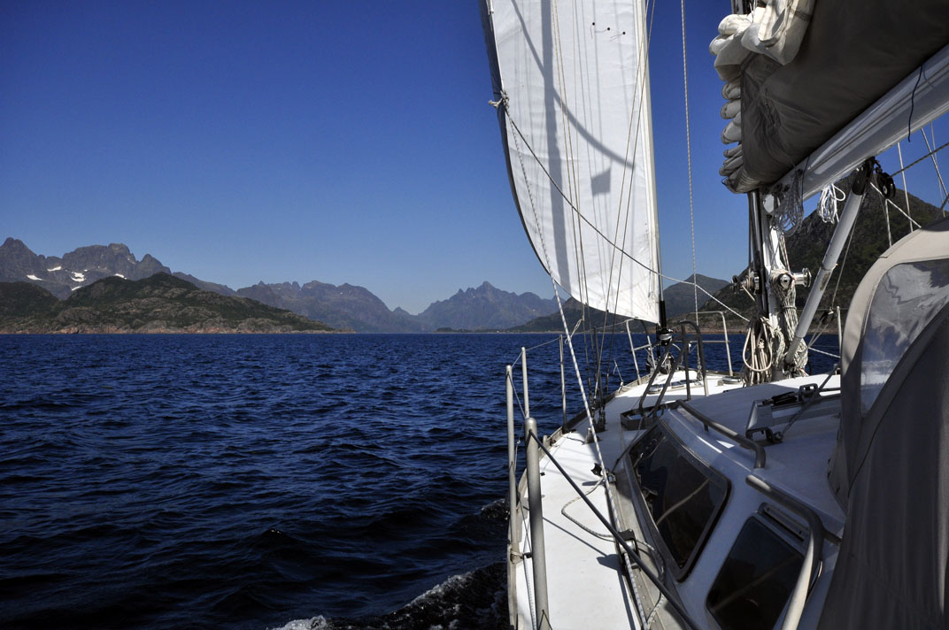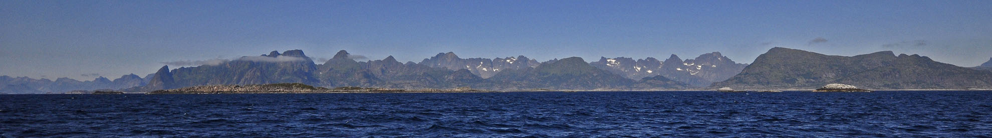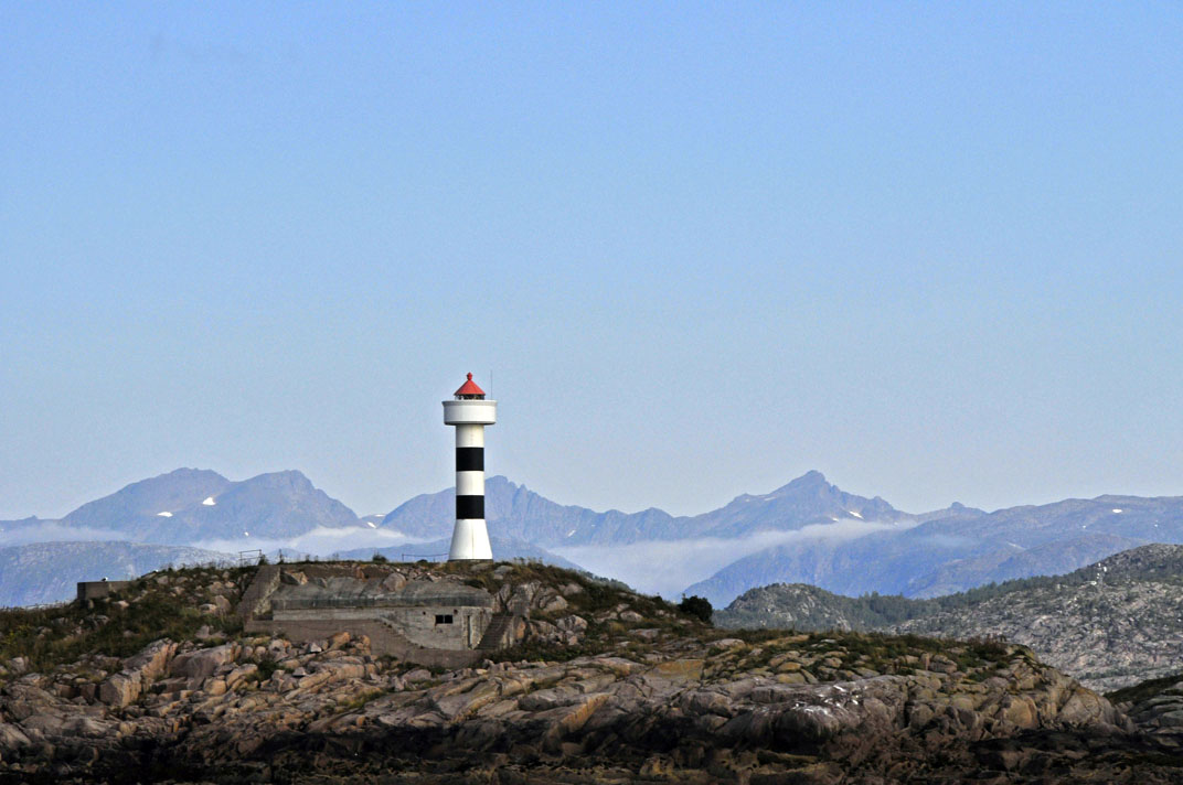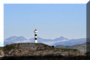 We left the next day and had a good run down the Oftoten Fjord. As we sailed West, the distant Lofotens rose over the horizin As everywhere around Narvik there are reminders of the German activity in the War, as well as great scenery. Notice the bunker tucked under the lighthouse at the entry to Ofoten Fjord |