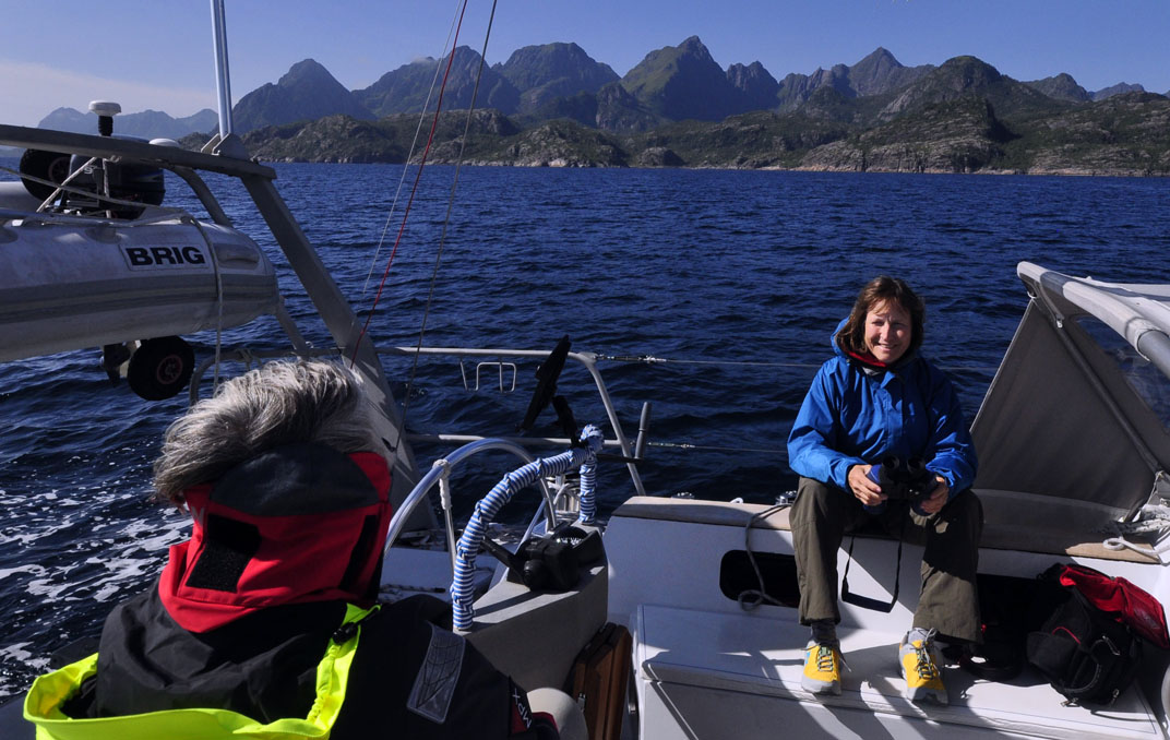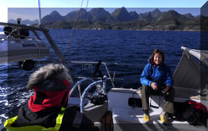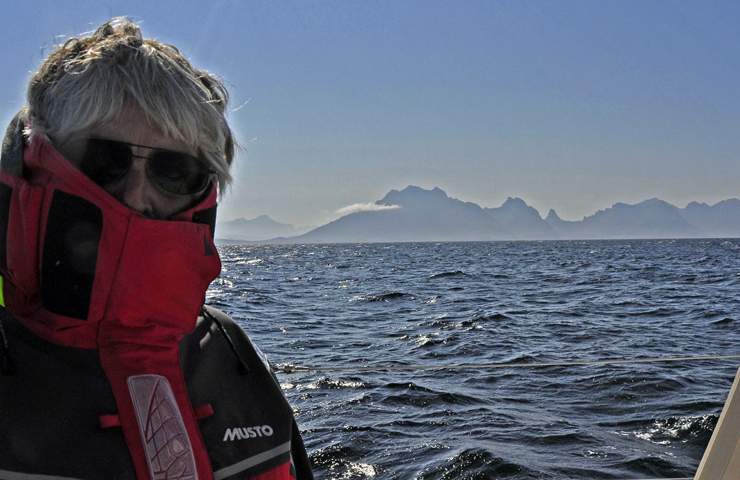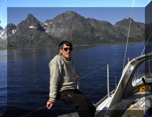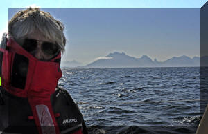 The island of Hameroy behind Helen looks cold, while the Lofoton peaks behind Neil look more inviting. (Double click any picture to see full size, then use the back button on your browser to return here) |