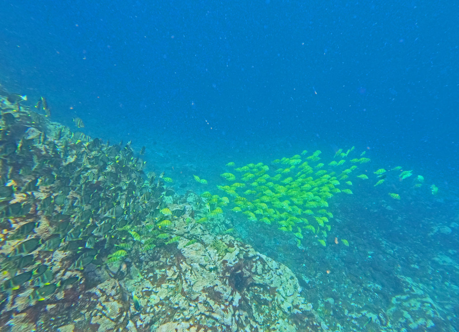 The water is very warm for snorkeling, and there are shoals of fish, but water clarity is not as good as the Gambiers. |