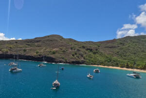 uninhabited Hanamoena Bay, snorkeling and preparing Milvina for laying up. The bay is popular with sailors, with a beautiful beach which is a challenge to land on. Usually we just swam ashore. When the work was done, we sailed the short hop to Hiva Oa boatyard to end the season and fly home. |