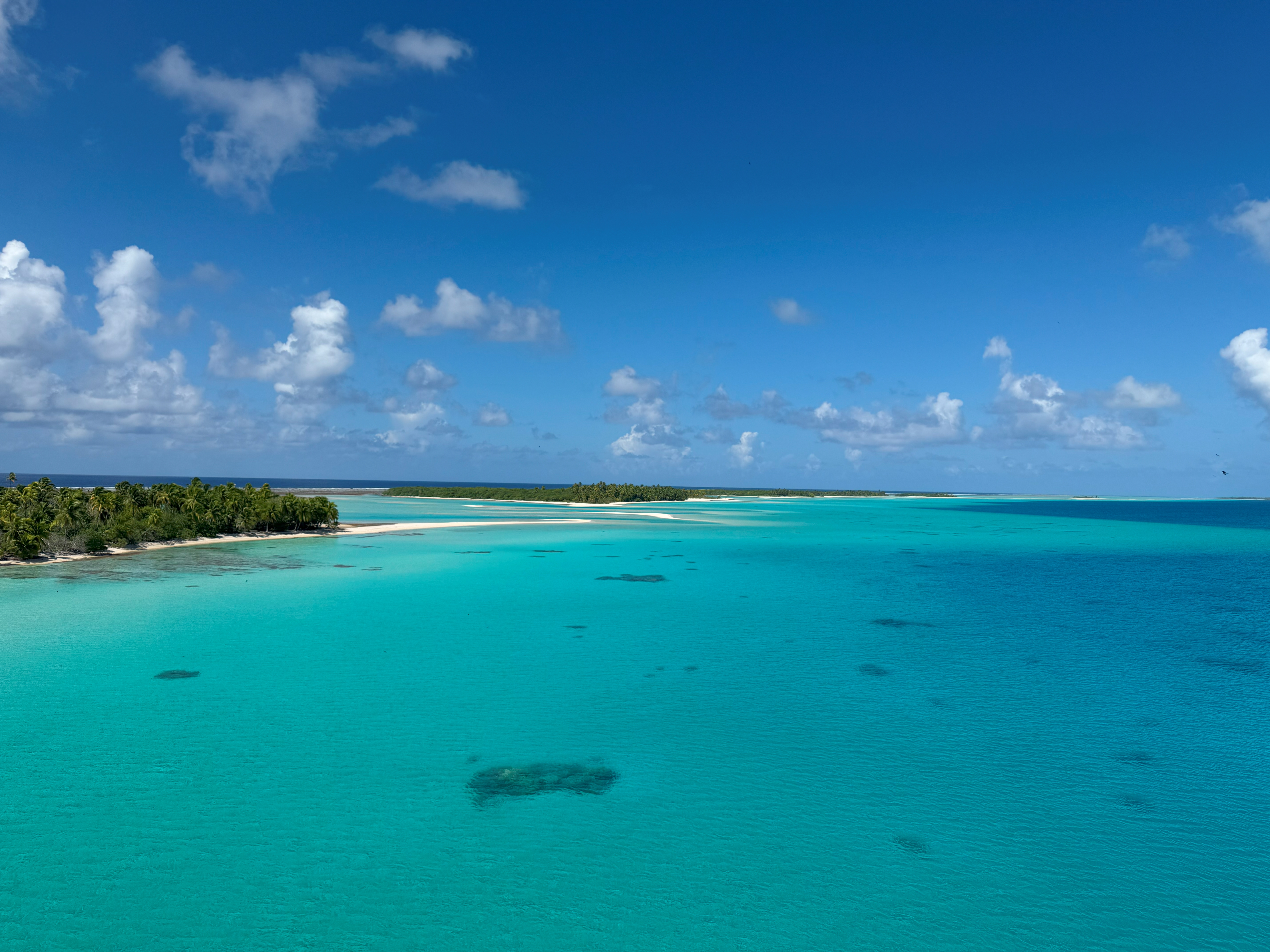 Tahanea is a park, so is uninhabited. This shot is from the masthead in the SE anchorage. A few bommies are visible on the sandy water |