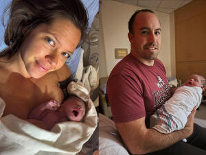 Myles, to Derek and Becca on the 29th of October. He was 3 weeks early, but everything went well and he is growing steadily from his initial weight of 3.5 kg (almost 8 pounds). He sounded as healthy as he looks in this picture with Becca when he was a few minutes old. |