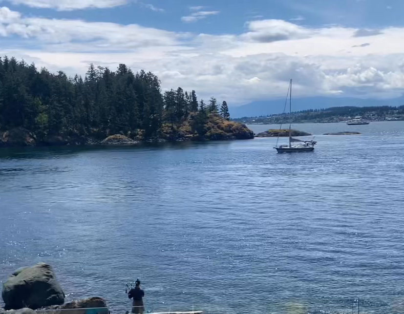We ended with Milvina being piped into Quathiaski Cove by our neighbour and anchoring just in front of our house. |